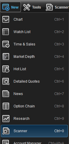 the basic scanner can be opened within the esignal program by clicking on new, then scanner from the main menu bar.