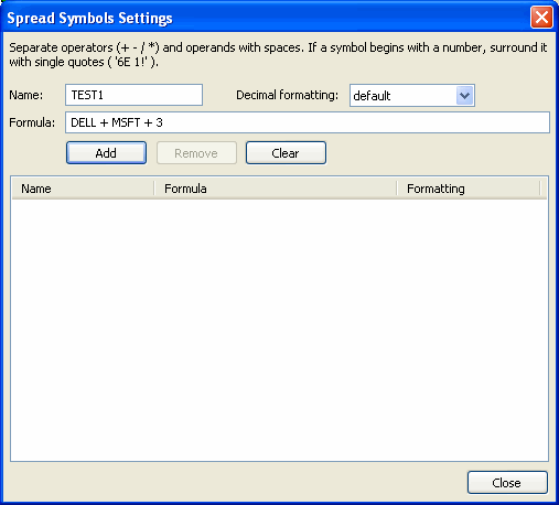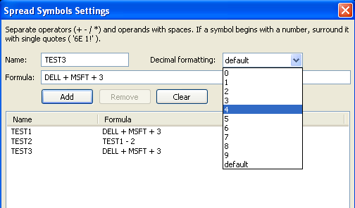 To create a TEST2 spread symbol for (DELL + MSFT + 3) substracting 2, my spread will be TEST1 - 2, because TEST1 is DELL + MSFT + 3. Another feature of the Spread Symbol Settings is the decimal formatting.