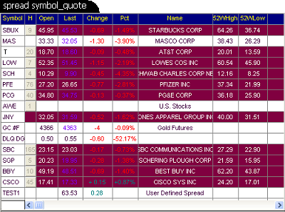 This window allows the user to create their own custom symbols by specifying a simple or complicated spread using parenthesis or multiple operators (+ - * /). In addition to using multiple symbols in a spread, the user can also use numerical constants such as MSFT + 50. Once a spread symbol has been created, this can be entered into other windows such as a Quote window or a Chart window to plot the results of the spread. You may also use the new spread symbol to calculate other spreads.