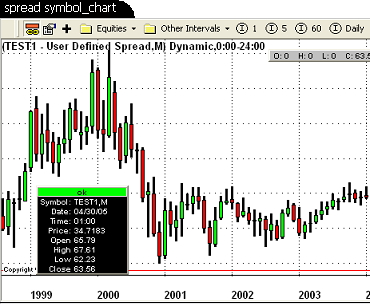 For intraday intervals, we actually pull down 1 minute bars for each of the symbols in a spread and do the same calculations as above, but on each 1 minute bar. The bar results are then compiled into the actual bars of the interval selected by the user.