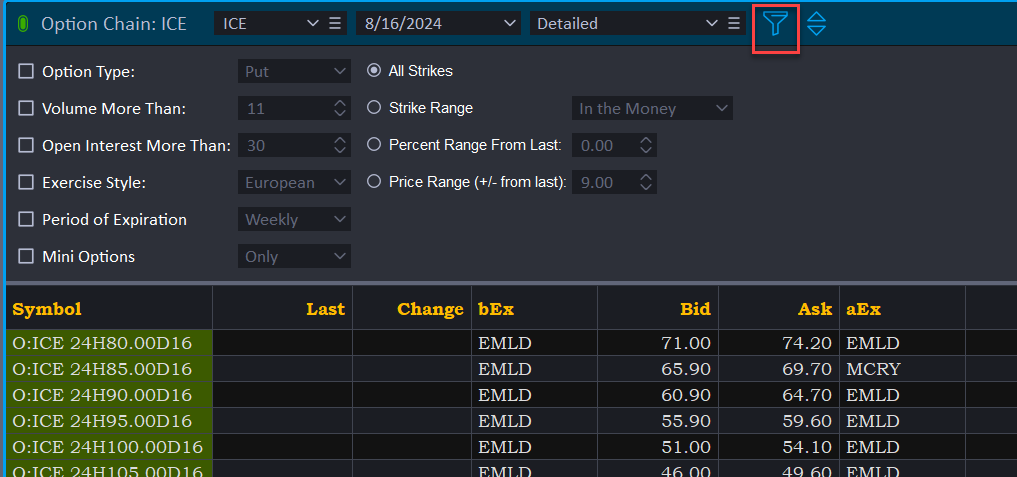 you can filter the option chain window displayed information based on type, month, strike price, and volume by using the filters available in the option chain window, or by clicking 'filters' in the drop-down menu bar under option chain. filters minimize the load times and reduce your total symbol count.