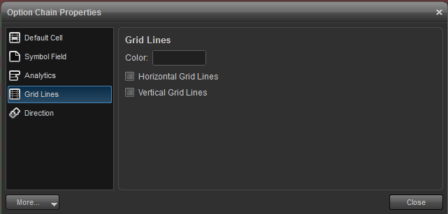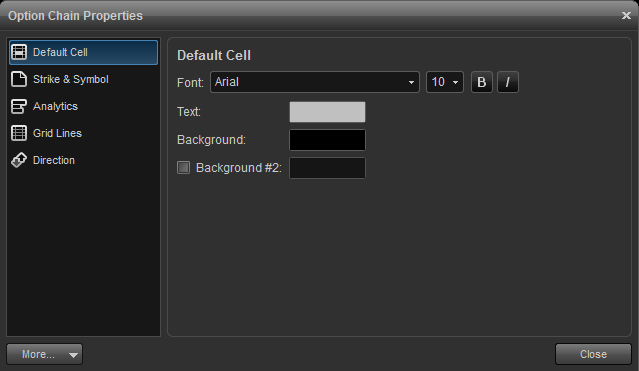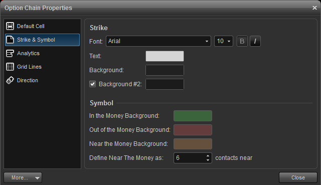 change fonts, colors, and of the symbol and colors for in the money, out of the money, and near the money contracts. also a setting is available to define how many contracts constitute near the money.