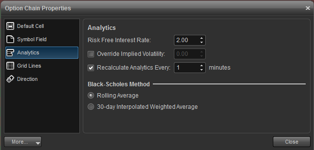Dynamic: When checked, options update in real time. This mode counts towards your symbol limit. When unchecked, a snapshot display is used which does not count towards your symbol limit. If you are using the Static mode, you can refresh the option window by clicking the connection status box.