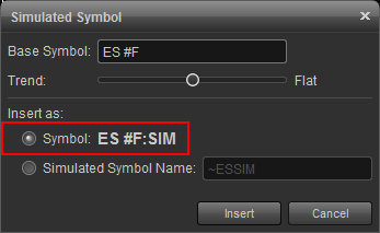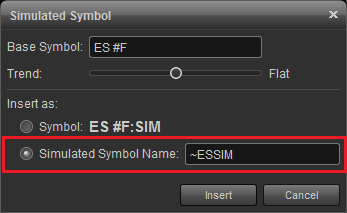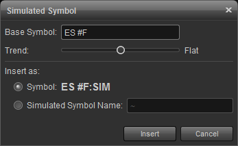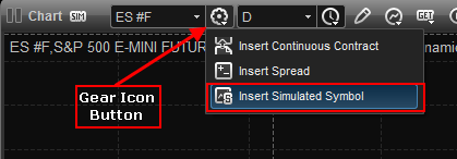 to use the data simulator you'll first need to insert a simulated symbol. left-click the gear icon next to the symbol field on the title bar of the chart and select insert simulated symbol. please note you can insert and use the insert simulated symbol in several window types such as the time & sales, market depth, etc. for our example we'll be using the data simulator with the chart window.