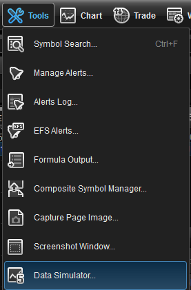 the data simulator generates a simulated data stream for any user defined symbol that can be instantly and constantly modified. it allows you to recreate specific market conditions including trends up or down. the data simulator includes the ability to test at any moment your formulas and/or strategies under these conditions without having to wait for them to occur in real time.